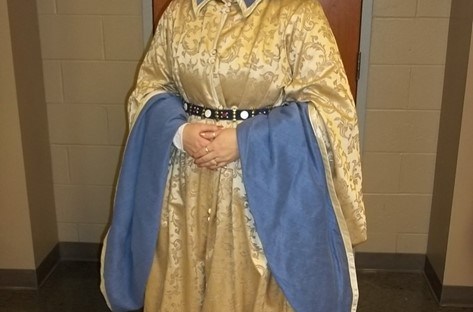 The houppelande is an outermost layer of dress, which was worn by middle-to-upper classes, both men and women. It was worn over a more fitted undergarment. It is identified by volumes of fabric neatly pleated into a belt, and visually balanced by a large hat.