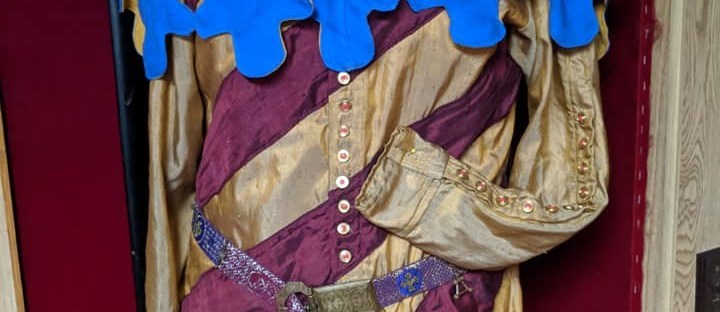 This cotehardie has the group livery colors and has silk stripes appliqued on the silk cotehardie lined in linen and a liripipe hood with dagges