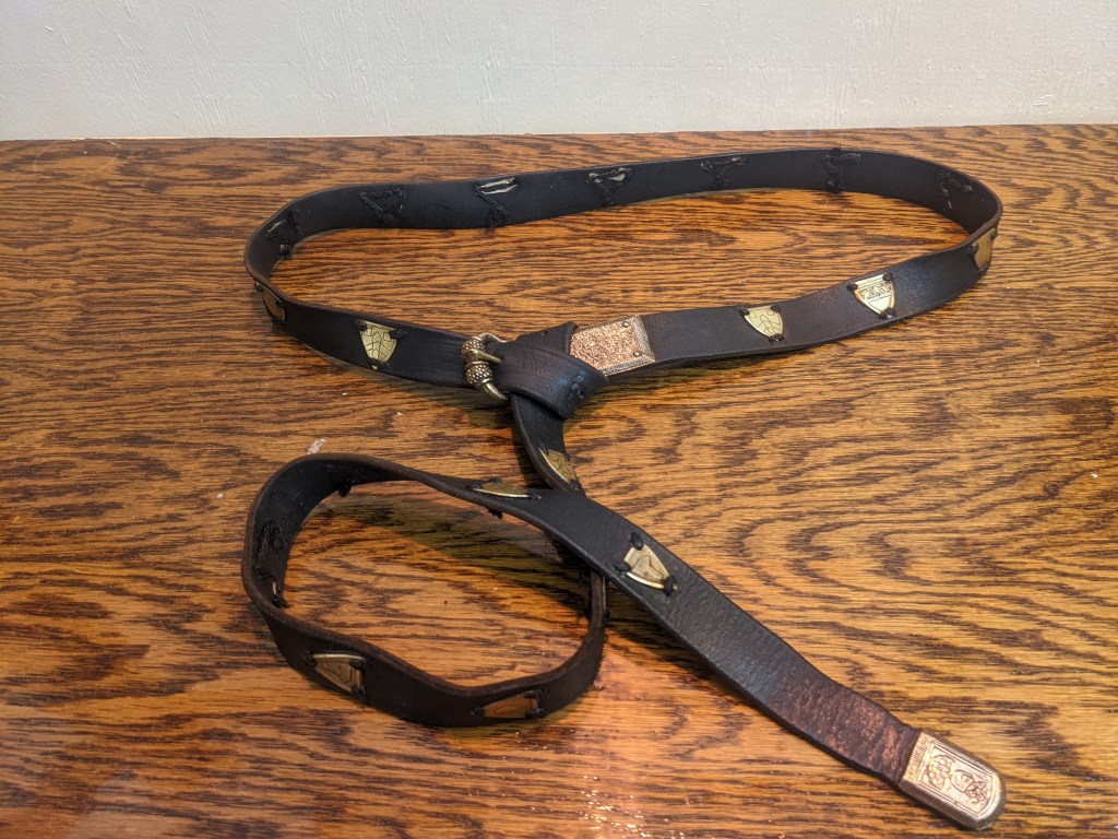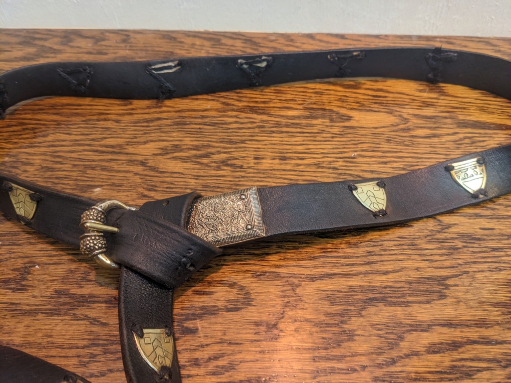 This is a narrow leather belt with preproduction buckle and tip purchased from an SCA merchant and the brass plaques are etched with various devices and batches associated with the owner