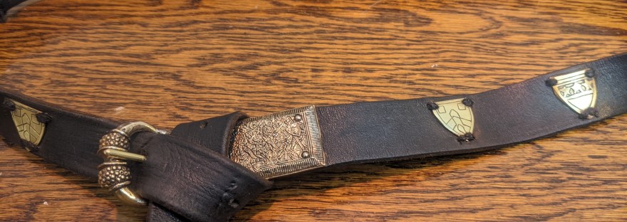This is a narrow leather belt with preproduction buckle and tip purchased from an SCA merchant and the brass plaques are etched with various devices and batches associated with the owner