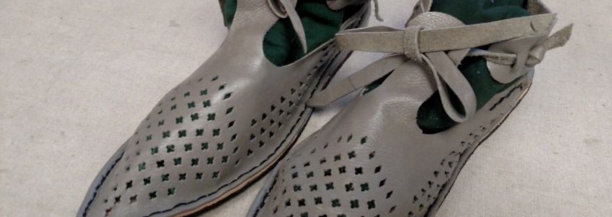 Low slip on shoes that are constructed from 2 pieces of leather. This simplified shoe construction doesn’t require the shoe to be turned inside out after constructing and it looks much like a turn shoe when worn. Shoes like these, in one form or another, have been used throughout the period covered by the SCA