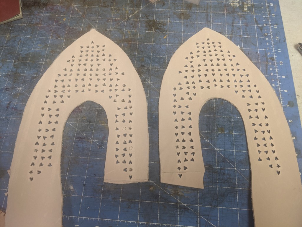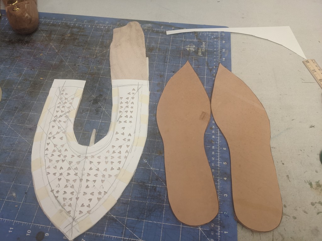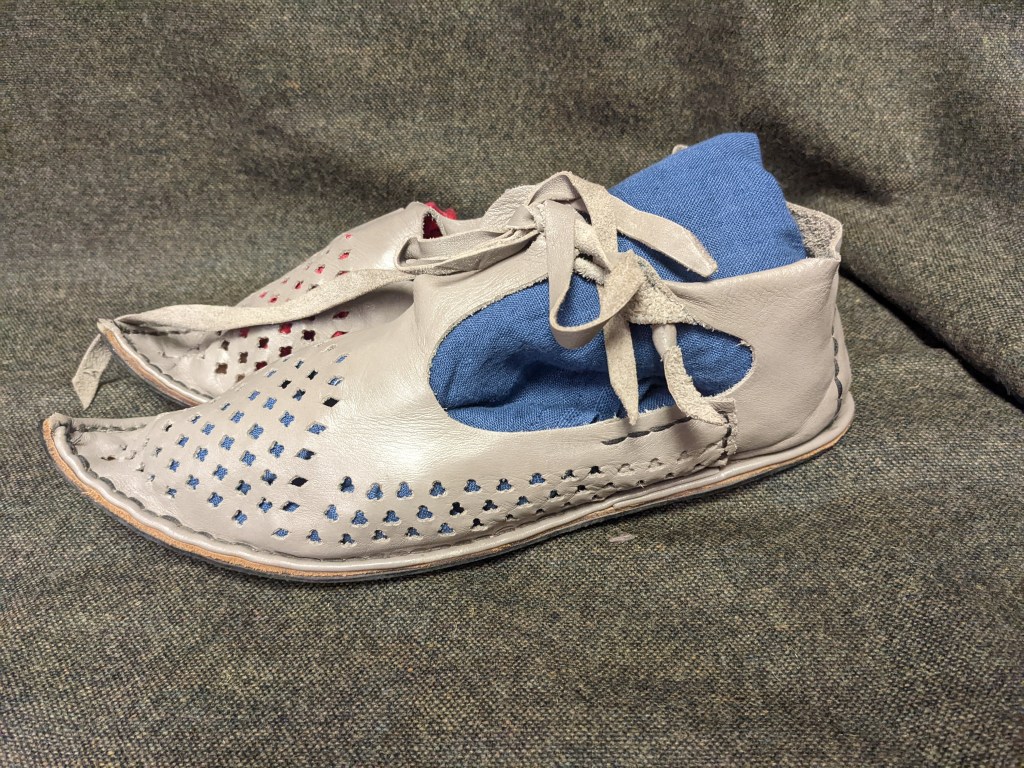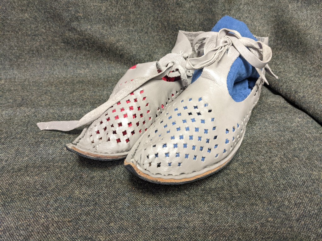 This pair of shoes is decorated by having a pattern of holes punched into the leather before assembling the shoe. Shoes decorated with punch decorations have survived dating back to Roman times. Sets of shaped punches can be purchased online for not much and the punching of the leather adds less than an hour to the total construction time.