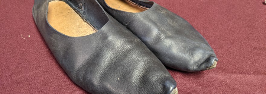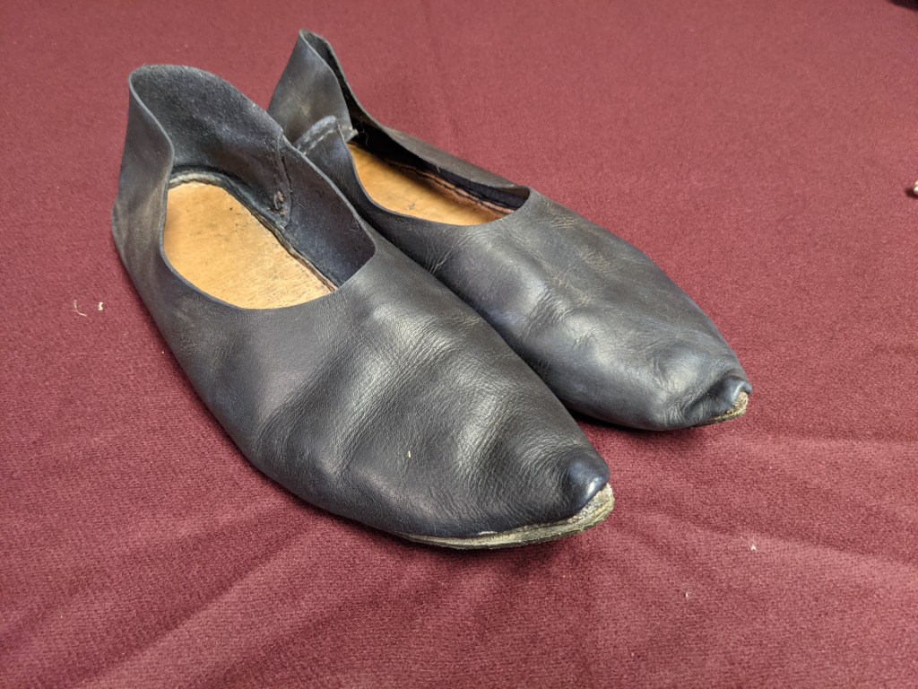 This pair of shoes had a stiffening sole and tread glued to the shoe after construction. Although this is a modern consideration, it was done for additional comfort and safety for use at events. Accommodations like this are common in the SCA.