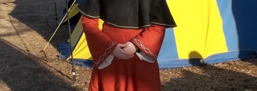 Red dress with embroidery along cuffs, neckline and hem line worn with a mantled hood. This was a dress constructed in the tunic like style similar to examples from 1100’s to 1200’s with slight bell sleeves. Worn over a tunic style underdress.
