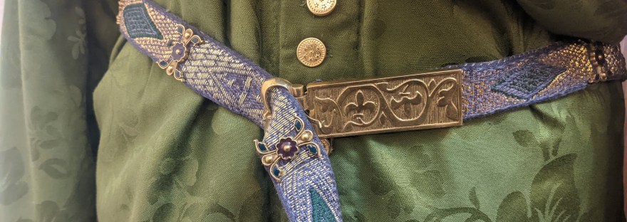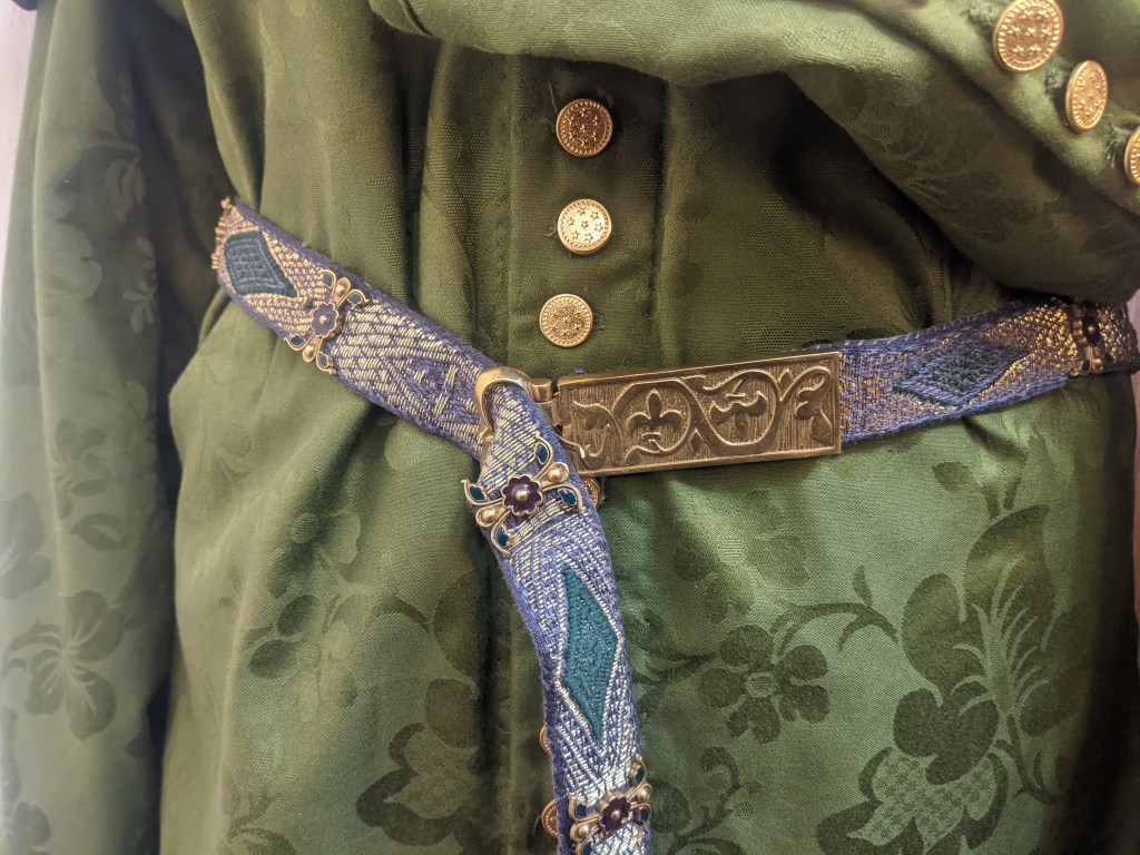 This is a tablet woven belt made in two layers. The outer layer is cotton with mylar wrapped thread that emulates gold thread used in period weaving. The images woven into the belt using a brocade technique. The belt is woven in two parts with a cotton inner belt and the layers are sewn together. The buckle is a reproduction of a 1200-1300’s buckle found in the Budapest Museum of History, Nomad hall purchased from a reenactor vendor.
