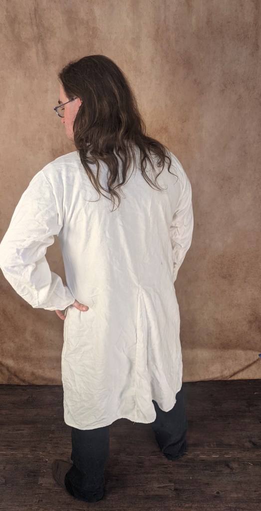 Wool coat lined with linen decorated with a tablet woven band. The coat is shown over a