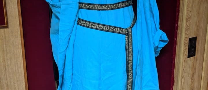 This is a simplified bliaut made from blue linen blend fabric constructed in a simplified way. It lacks decoration or lining but is a very simple to construct garment