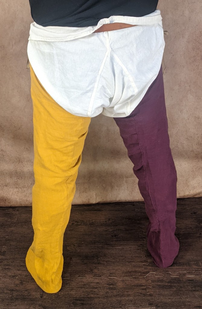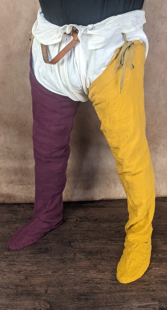 This is an example of split hose made out of linen and parti-colored. They have enclosed feet and a hole at the side to tie to a belt or girdle. They may commonly be seen with a garter tied just below the knee to assist in keeping the hose from slipping. The garter may be a tied woven band or a band with a buckle.