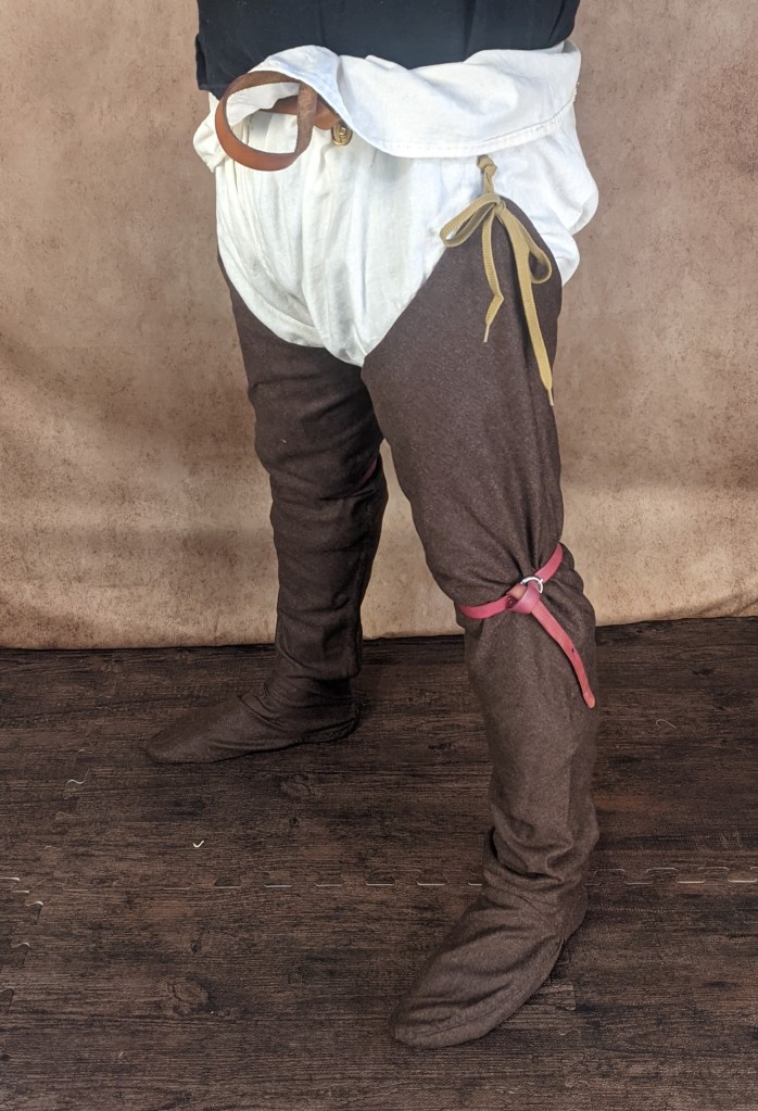 This is an example of split hose made out of wool. They have enclosed feet and a hole at the side to tie to a belt or girdle. They may commonly be seen with a garter tied just below the knee to assist in keeping the hose from slipping. The garter may be a tied woven band or a band with a buckle.