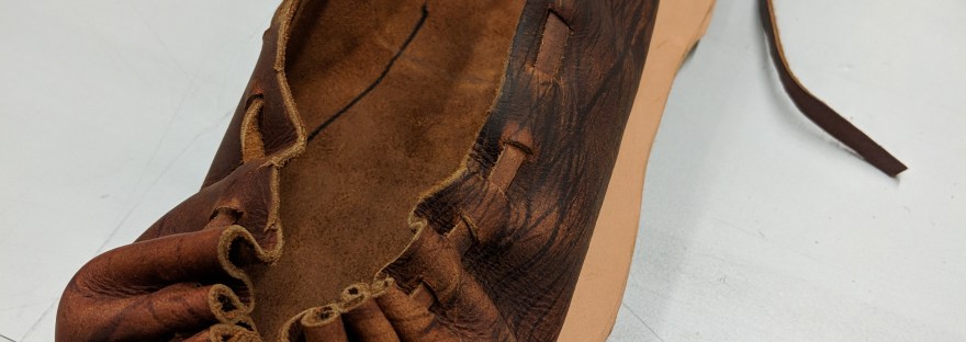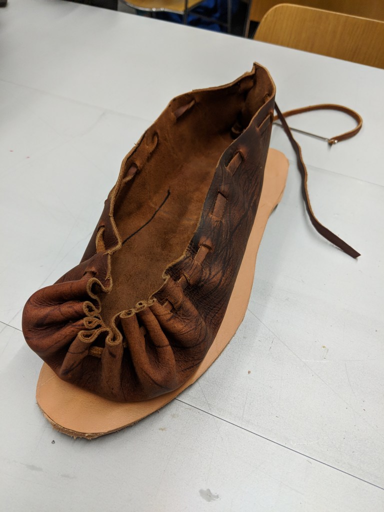 Low slip on shoes that are constructed from a single piece of leather and a leather thong. Evidence of shoes much like this have been found to our knowledge, from sites ranging from 3000 BCE to 1200 CE or later. Basic shoes of this style have also been found in the archeological record across Europe.
