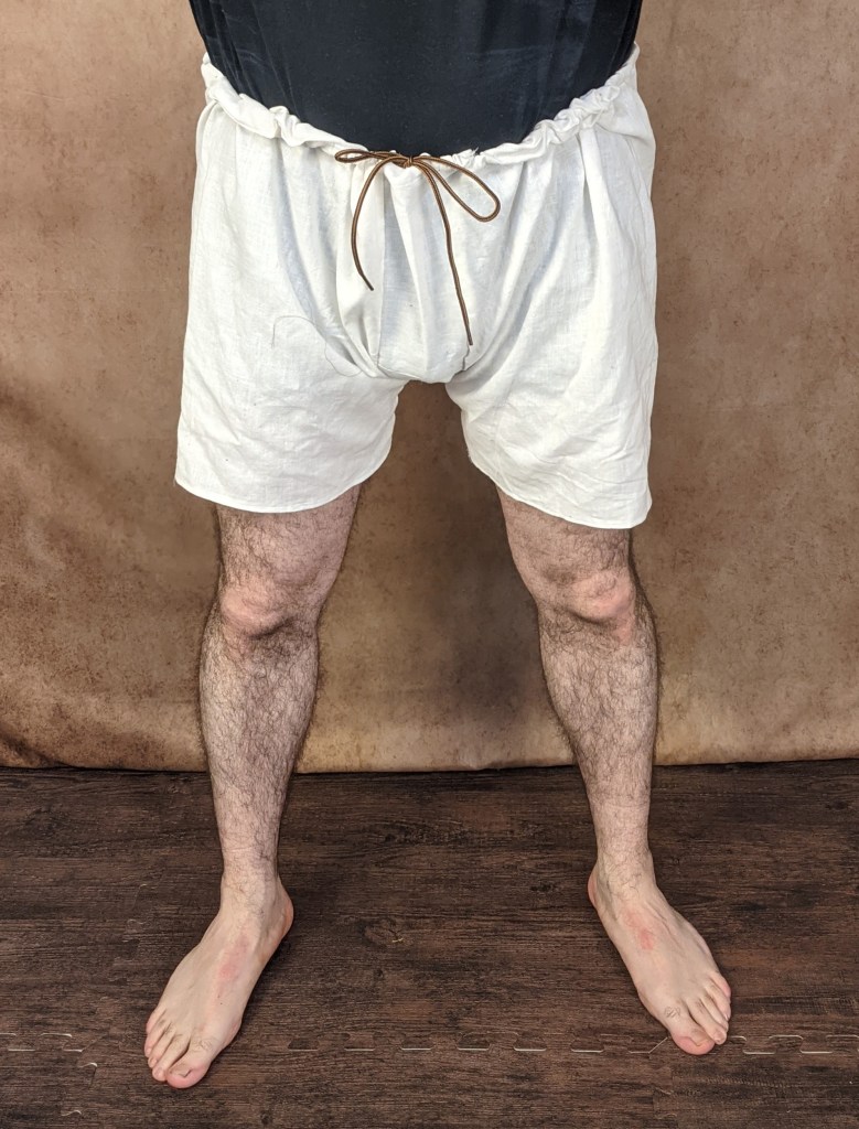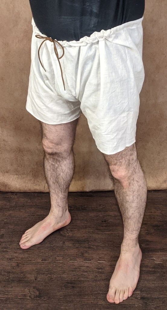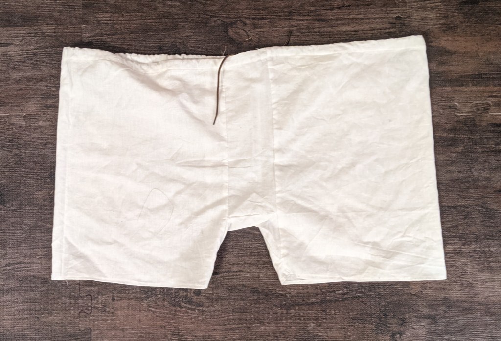 This is an attempt to replicate one of the very basic ‘boxer short’ style braies. It is made from 3 pieces, either leg is sewn up the leg and sewn together with a central panel between either side. The waistline is folded over to allow for a drawstring.