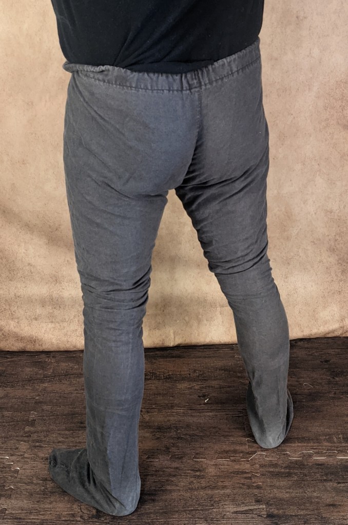 Enclosing the feet allows for pants like this to be a simplified replacement for hosen, joined hosen or some of the other enclosed pants. Although probably an oversimplification, it is an easily constructed garment and can serve as a placeholder until one learns to ‘drape’ a pattern for hosen. Patterns are easily generated by laying an example of a normal pajama pants that fit the person on a folded pieces of paper. The pants are sewn long and the parts extending over the feet are pinned, resewn and trimmed until they fit. Care must be taken to leave the pants loose enough to pull over the feet.