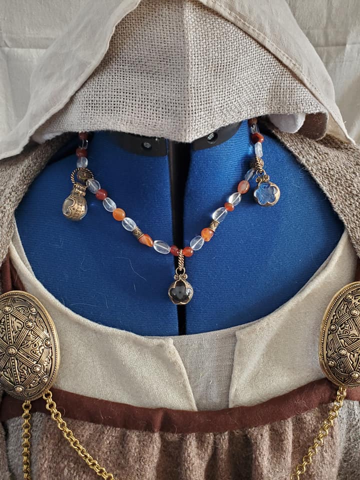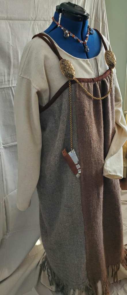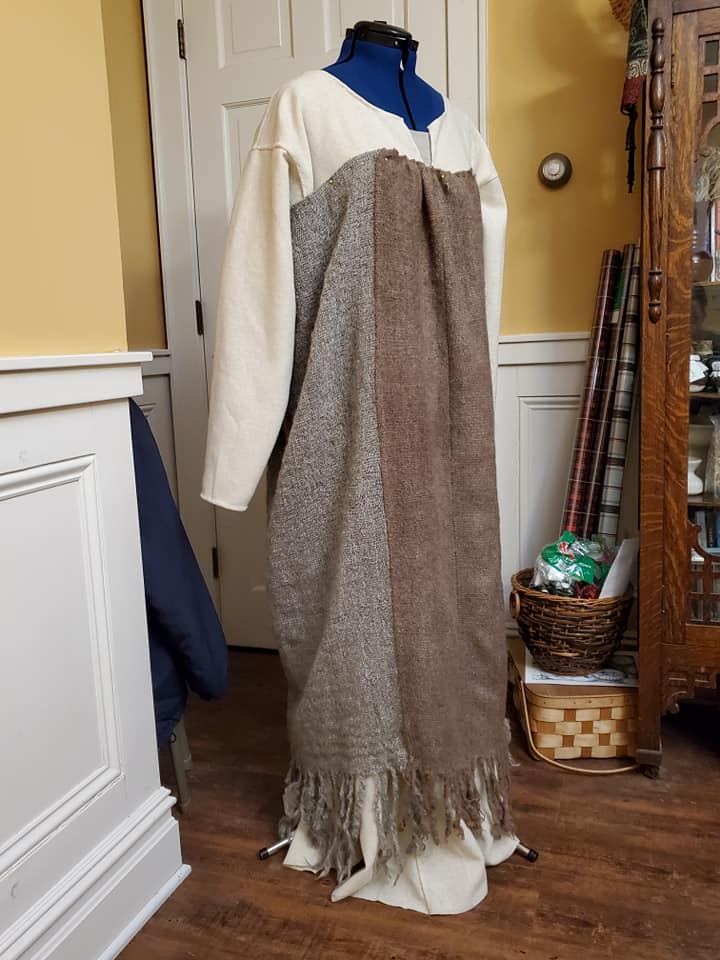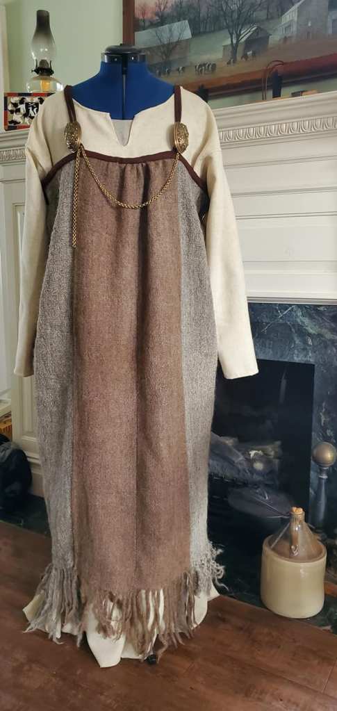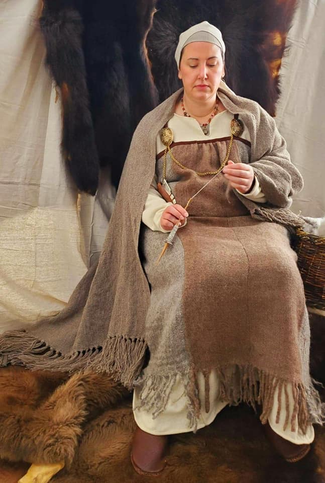 I’m hoping to create an ensemble that would have been worn by the Norse wife of a fairly well-off land owner in 10th century Jorvik. The piece is not based on any single burial find, but takes inspiration from several. The plan is for wool stockings, a linen underdress, a woolen dress and apron with jewelry and a head covering. The goal is to spin and weave a component of the ensemble.