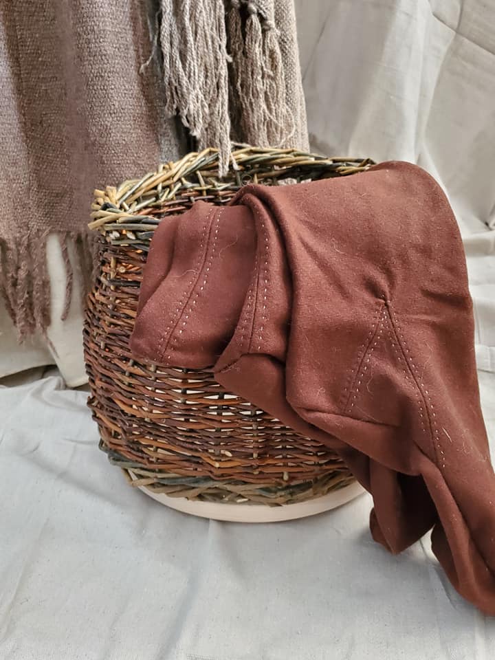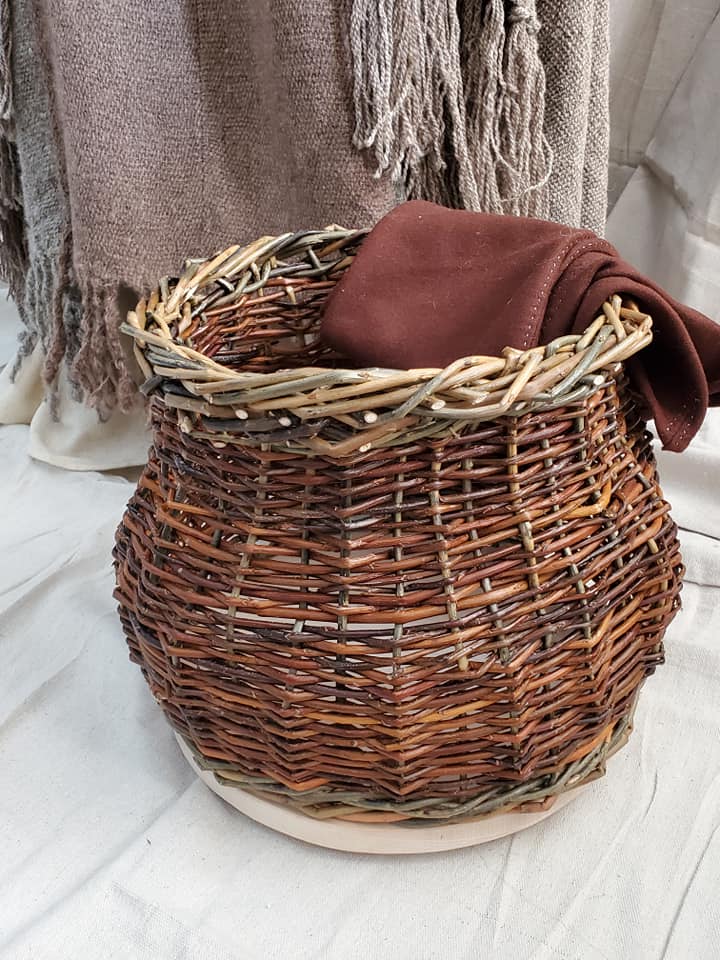 My judged accessory is a willow and oak basket. The most explanation that I could find on viking baskets that were not the Gokstad backpack was the following reference “Round and square basket bases were found in the Scandinavian settlement in York, England, then known as “Jorvik.” The bases have holes around the perimeter, indicating that sticks or reeds may have been seated there, serving as the vertical staves to support the horizontally-woven bands.”