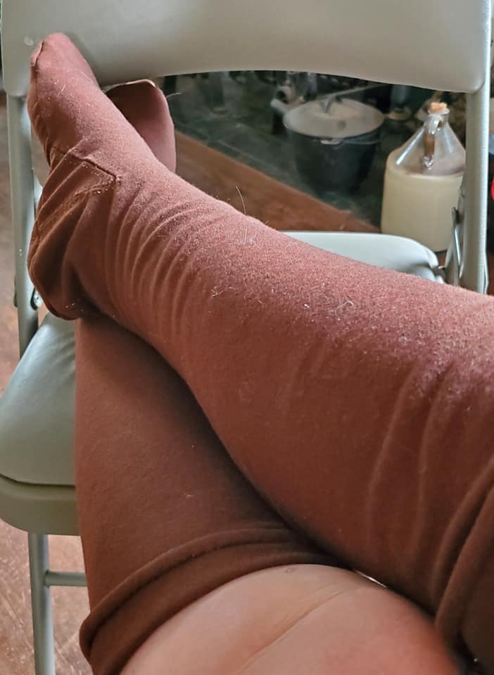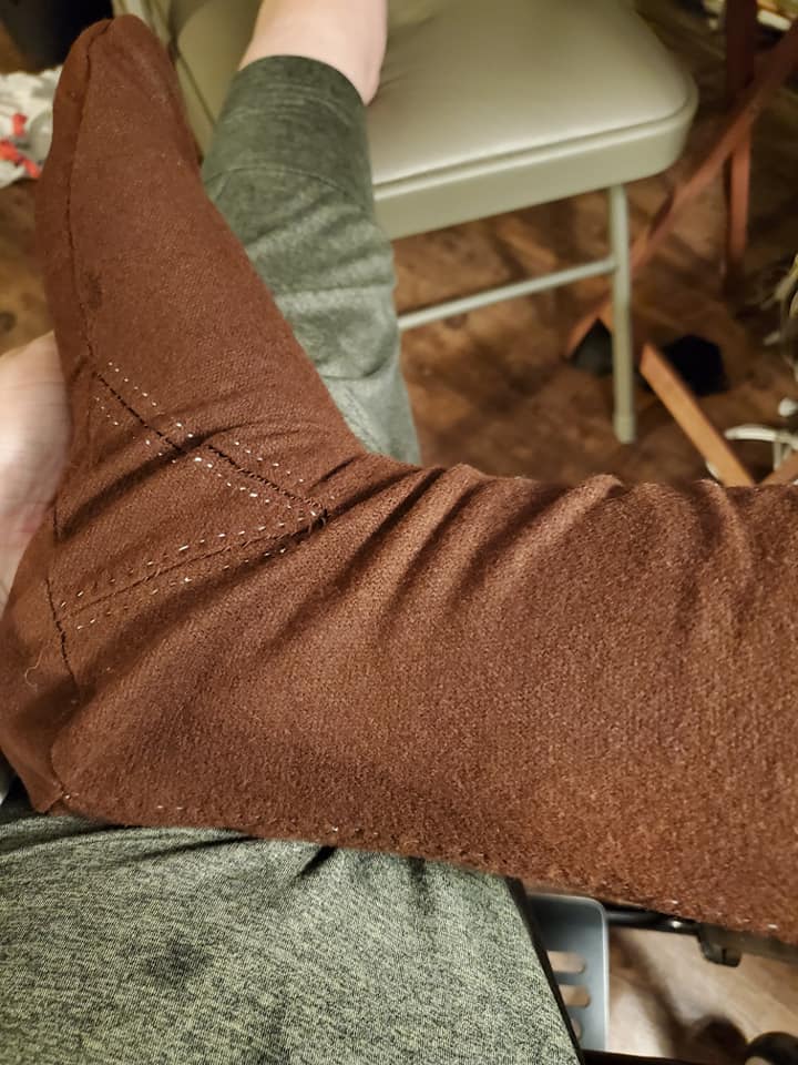 seams and tacked them down using a running stitch and matching threads. For my stockings, I struggled a little deciding what to make. Many of the current interpretations from archeological finds seem to have a seam running along the sole of the foot, which I was afraid would be very irritating as I have some nerve issues from the paralysis. I also knew that I wanted the stockings to end below the knee, as I didn’t want to have any fabric bunched behind the knee as my legs are always bent. In the end, I used a pattern that I had drafted about ten years ago from “The Medieval Tailor’s Assistant” as I knew that it was comfortable to wear. The stockings were made from brown wool flannel, hand sewn and the seams were tacked down using a running stitch in contrasting thread.