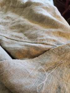 The seams are handsewn; however, the fabric is a very loose weave and I did have trouble keeping the seams from unraveling. The fabric is thick enough that bound seams were becoming very bulky. Because getting dressed in the wheelchair can require a lot of tugging fabric into place, I reinforced a few of the seams on my sewing machine. This is the only machine sewing in the entire project.