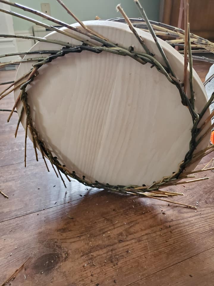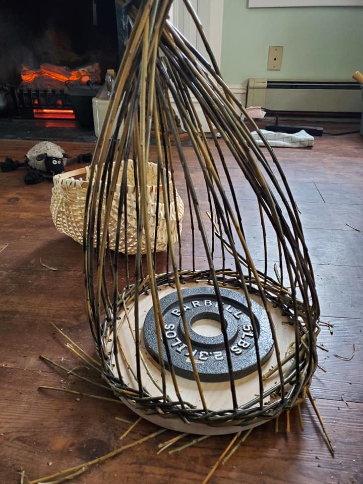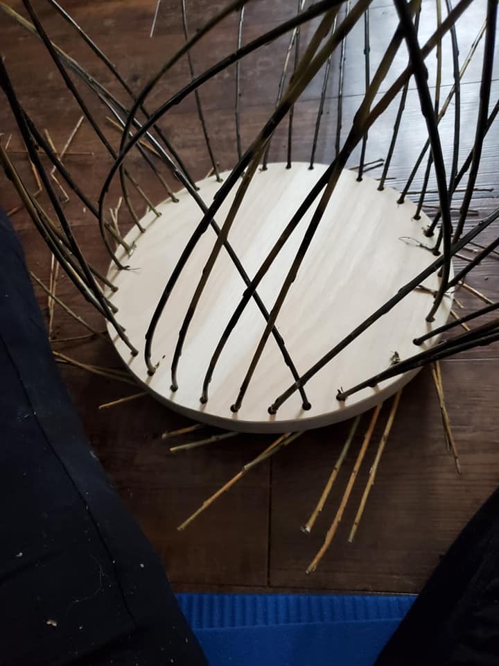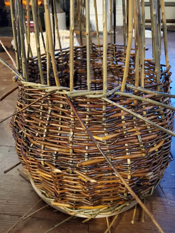 My husband cut and drilled the oak base for me, as the majority of our woodworking tools are in the basement which is not wheelchair accessible. I soaked the willow for a week and then wove the basket using a 3 rod wale for the bottom and top edges and a single plain weave for the body. I’ve made baskets before, but this was my first willow basket and my first with a solid base.