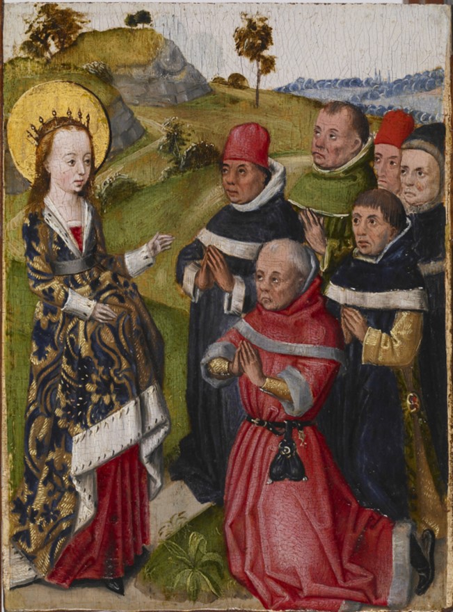 One of the garments that there are many image examples for as this is a time of many surviving artworks. A style of dress seen in many Flemish paintings that show a common set of features including fitted torso with deeply plunging neckline and collar with contrasting fabric or fur lining. The deep neckline displayed an under placket or partlet or kirtle, some displayed without. Sleeves often shown with lined cuffs that are rolled back on the sleeve. Most show no seam at waist or a wide belt covering any such seam. More examples of images showing the waist seam appear closer to 1500CE. Many are displayed as being lined