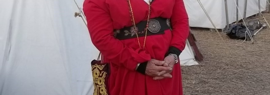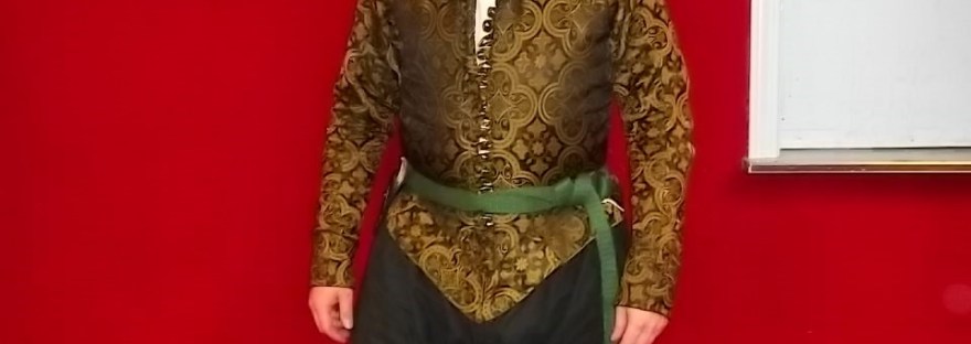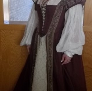“A” shaped dress with “V” shaped neckline, fitted in the torso and spreading widely, often with train from the waist. Wide belt at waist. Worn over fitted kirtle.