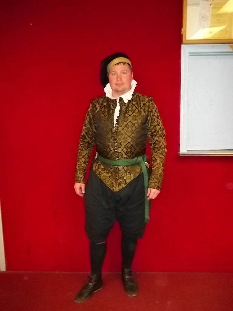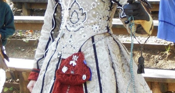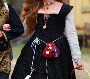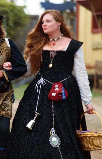 The Elizabethan Gown is a decorated bodice and skirt worn over a chemise, corset and farthingale