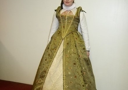 The Elizabethan Gown is a decorated bodice and skirt worn over a chemise, corset and farthingale