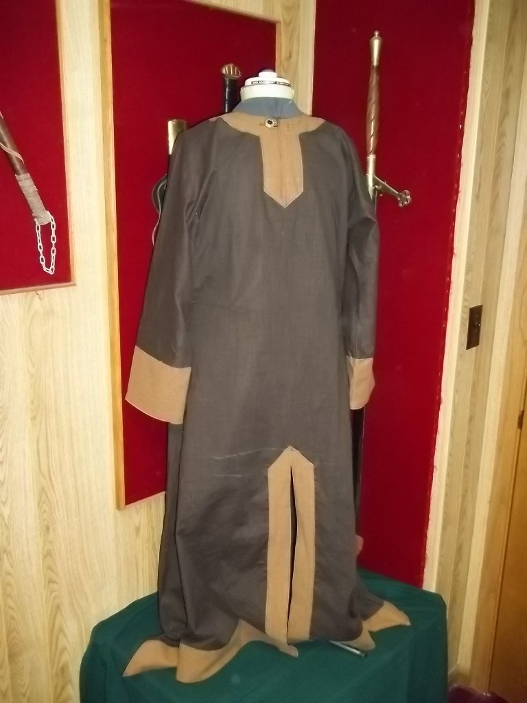 This variation was cut T tunic style out of a wide piece of fabric to minimize seams. A more period cut would include seams connecting the sleeve to the body. Trim is an applique of linen. Keyhole neck is held closed with a brooch pin. Tunics are about the easiest garments to construct.